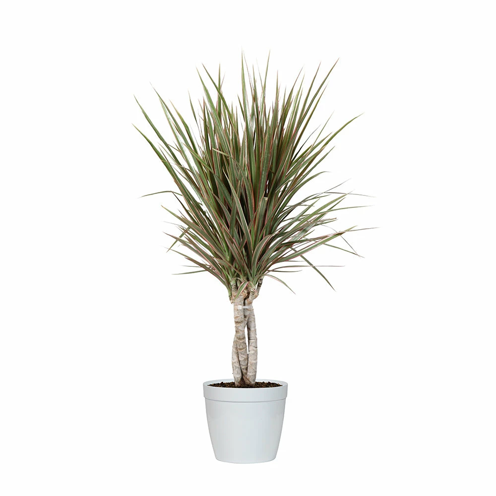 A wonderfully braided stem and healthy large foliage reminiscent of the tropics: the Dracaena Bi-Color Braided Plant is an impressive pick. It ticks all the boxes of a house plant must-have. What else sets this bold botanical apart? For one, it boasts dark red outer edged leaves are complemented by a green center.
