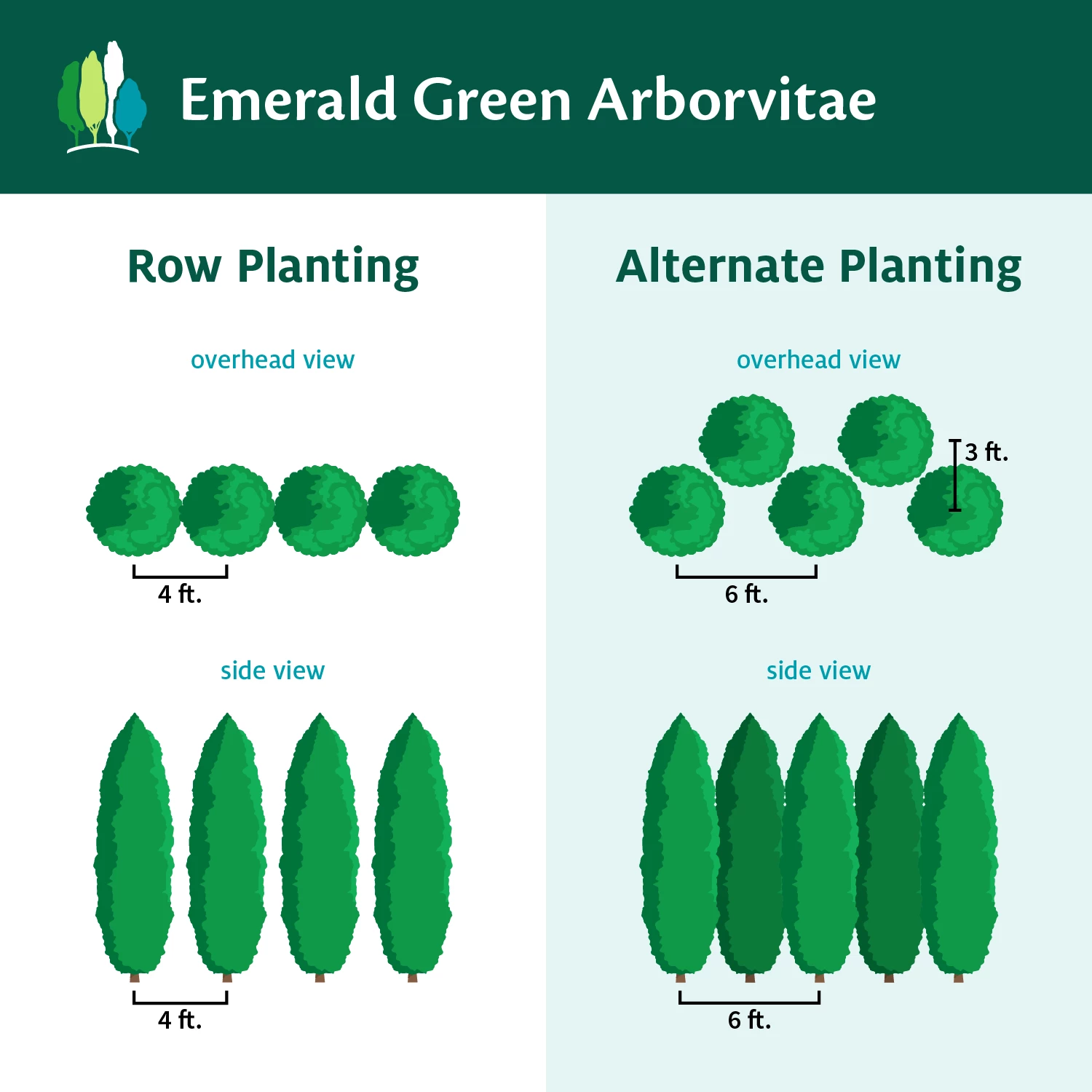We recommend planting your Emerald Greens around 3 to 4 ft. apart from one another and other structures and plants.