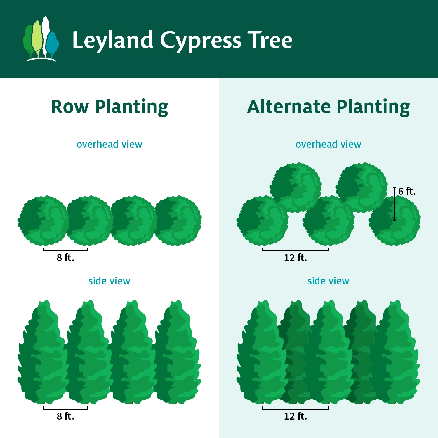 1. Planting: Leyland Cypresses grow to heights of 50 feet with a canopy that can spread out to about 25 feet. If you want a taller hedge, screen or windbreak, young trees should be spaced at least 25 feet apart. If you’re growing a hedge, a space of 8 to 10 feet between trees is ideal. It will take about five to seven years for the space between the trees to fill.